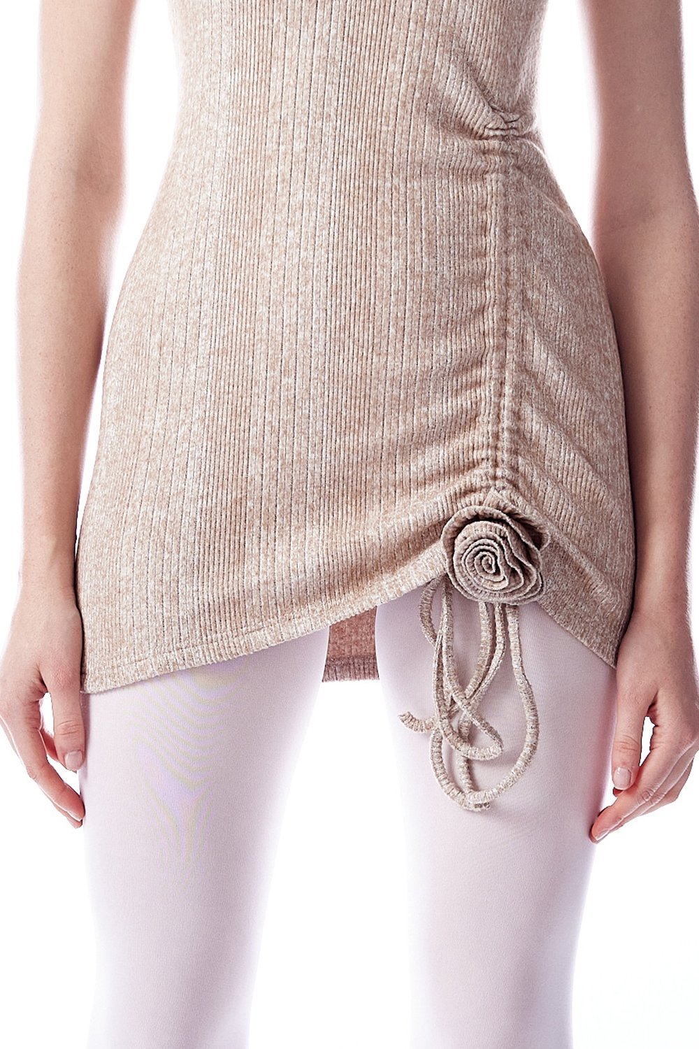 This dress combines romantic and modern lines, drawing attention with its ruching details and delicate rose embellishment. You can complete the look perfectly with boots or heels.