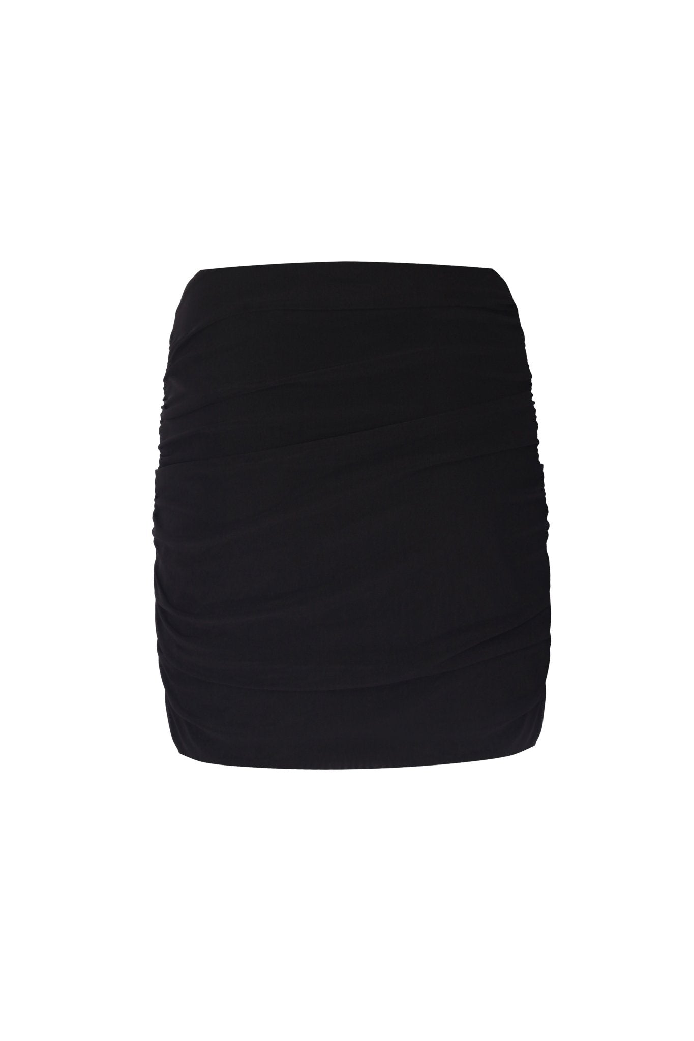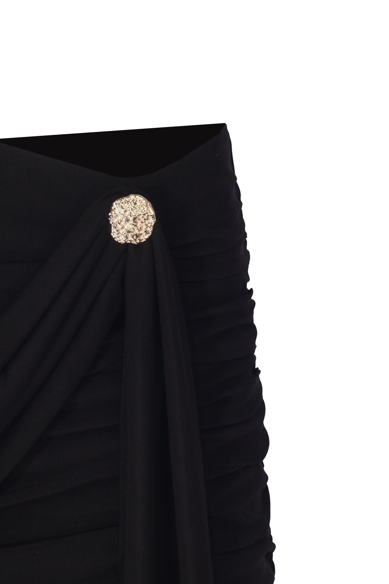 The Bardot Mini Skirt creates a feminine silhouette with its draped design and tulle lining. A gold button detail at the side adds an elegant touch to the look. Its mini length makes it a chic choice for everything from evening events to special occasions.