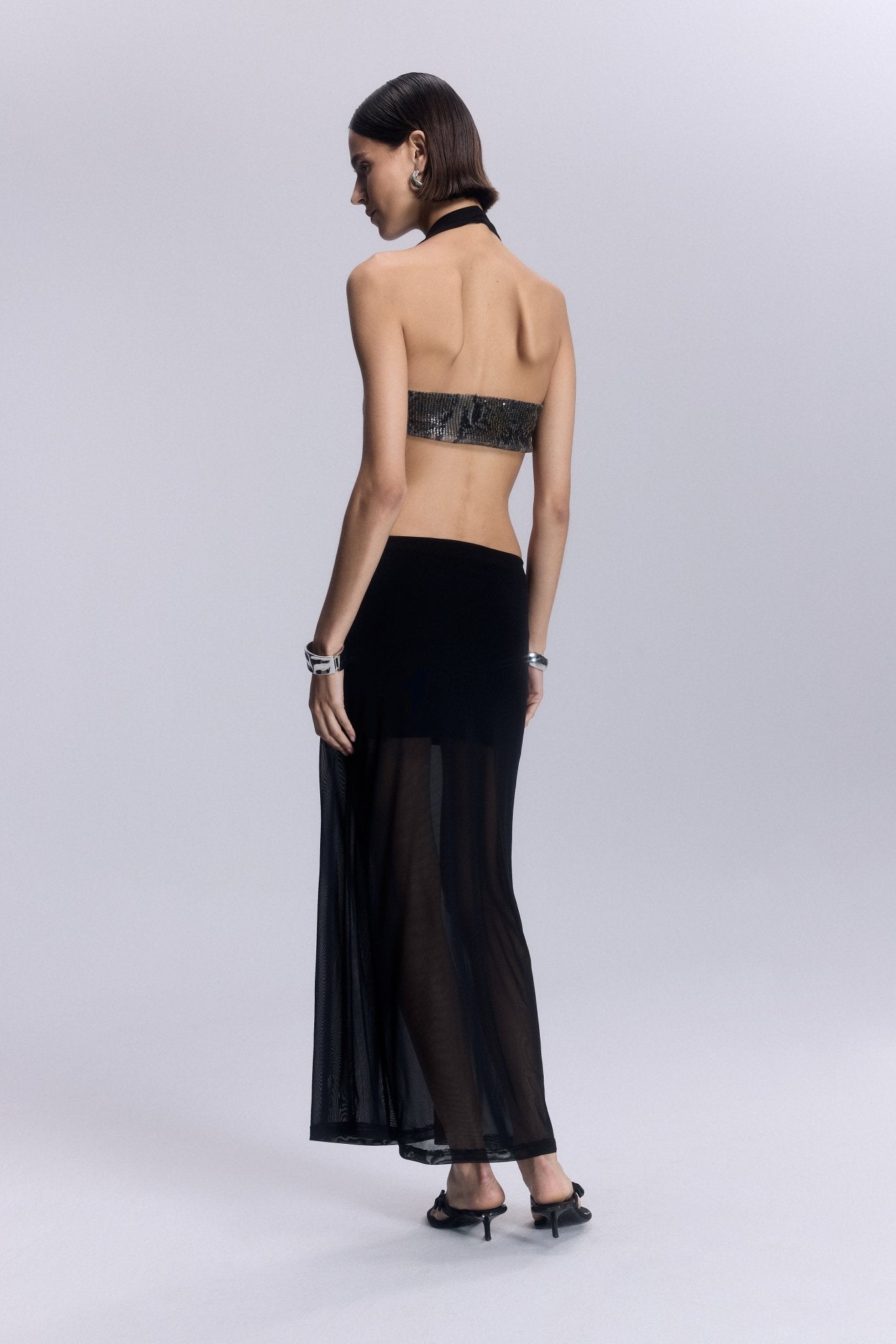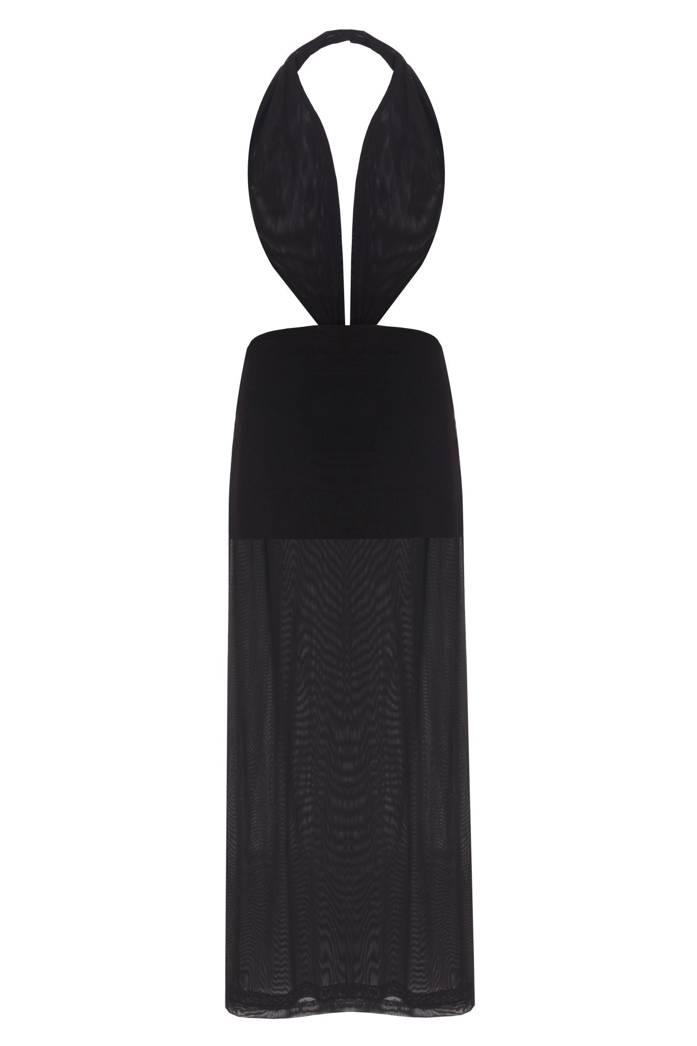 The Mata maxi dress offers an elegant look with its black tulle skirt and lining. Silver button details on the front add a sophisticated touch, while its flowing silhouette highlights timeless style. An ideal choice for evening events and special occasions.