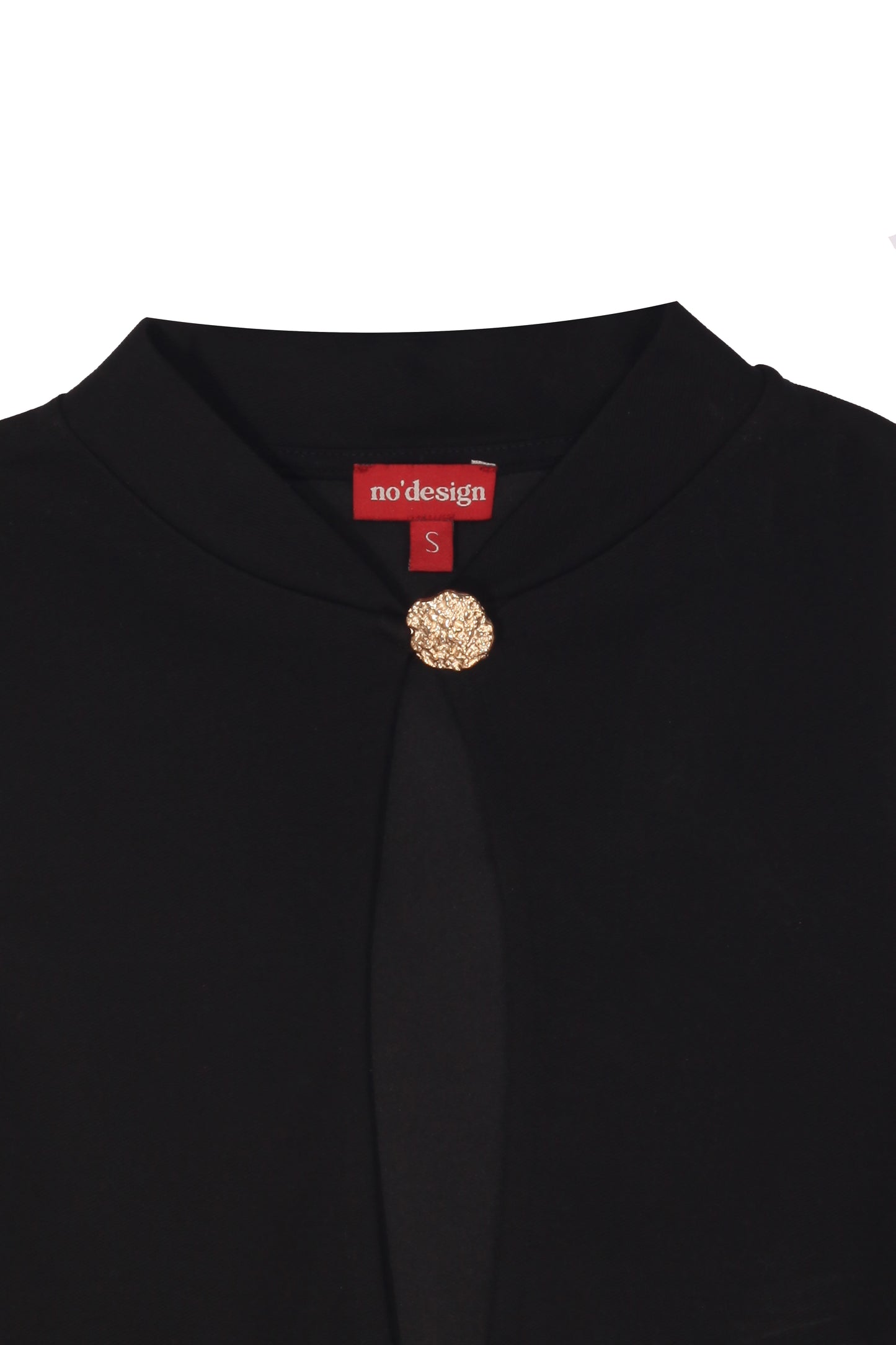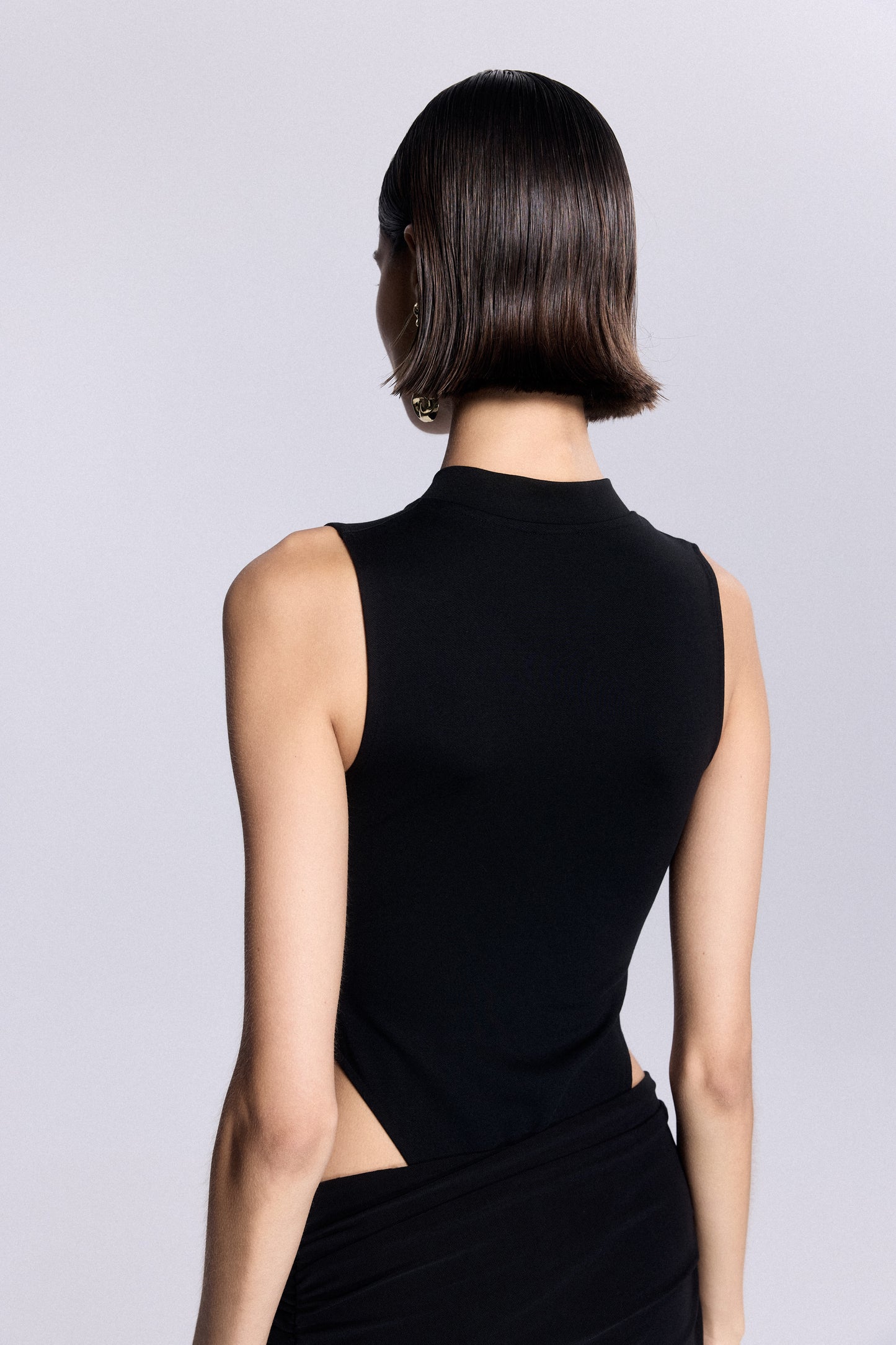 With its modern and bold design, the Monica Bodysuit offers a sophisticated look with a deep neckline and gold button detail at the front. The snap closure at the bottom ensures easy wear, while the functional top button allows versatile styling.