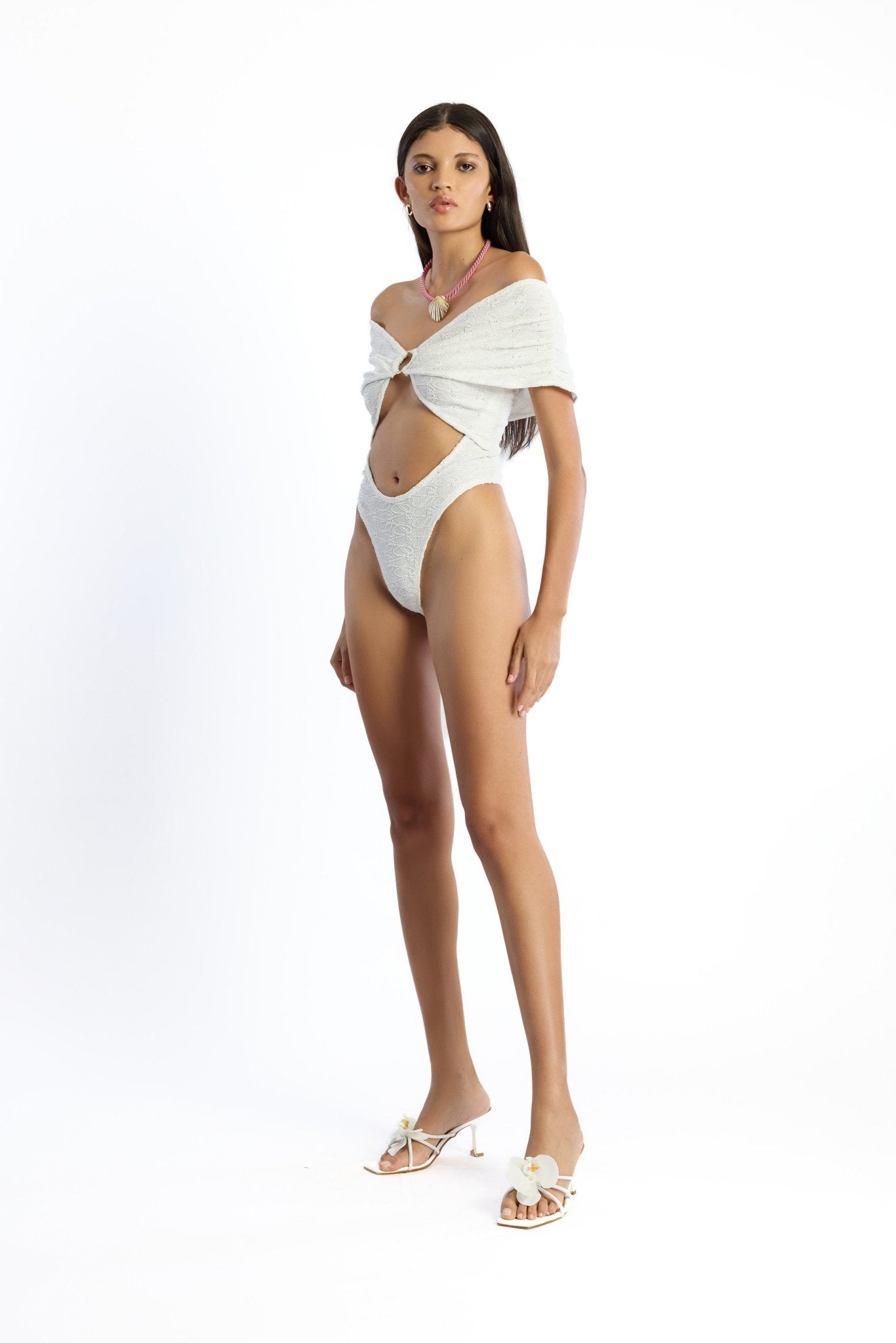 With its off-shoulder Madonna neckline and center ring detail, the Maze bodysuit embodies both elegance and boldness. Perfect for summer events, it pairs effortlessly with skirts or trousers.