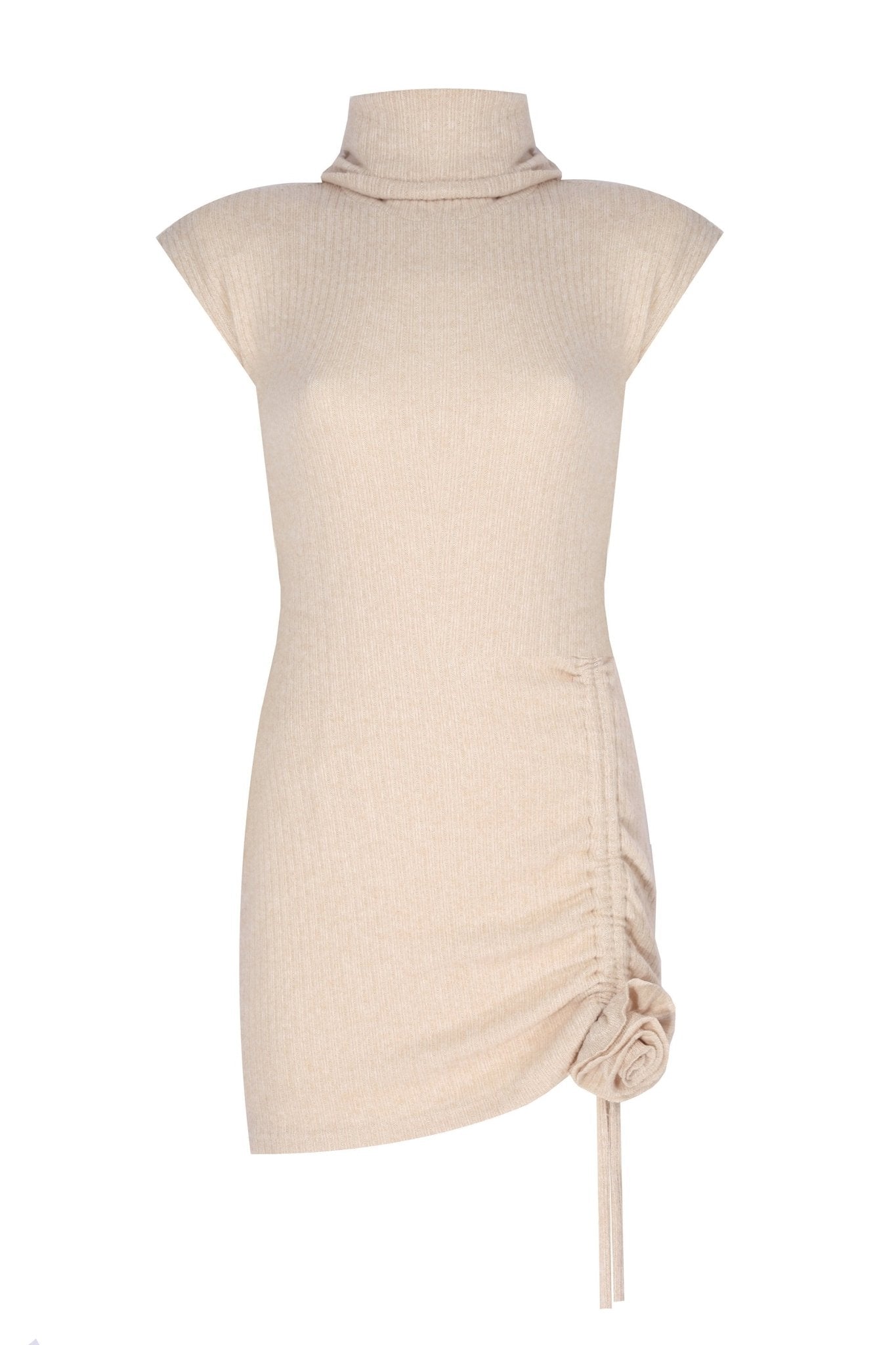 This dress combines romantic and modern lines, drawing attention with its ruching details and delicate rose embellishment. You can complete the look perfectly with boots or heels.