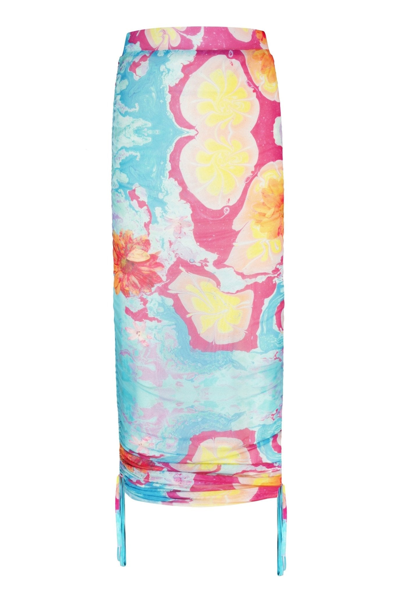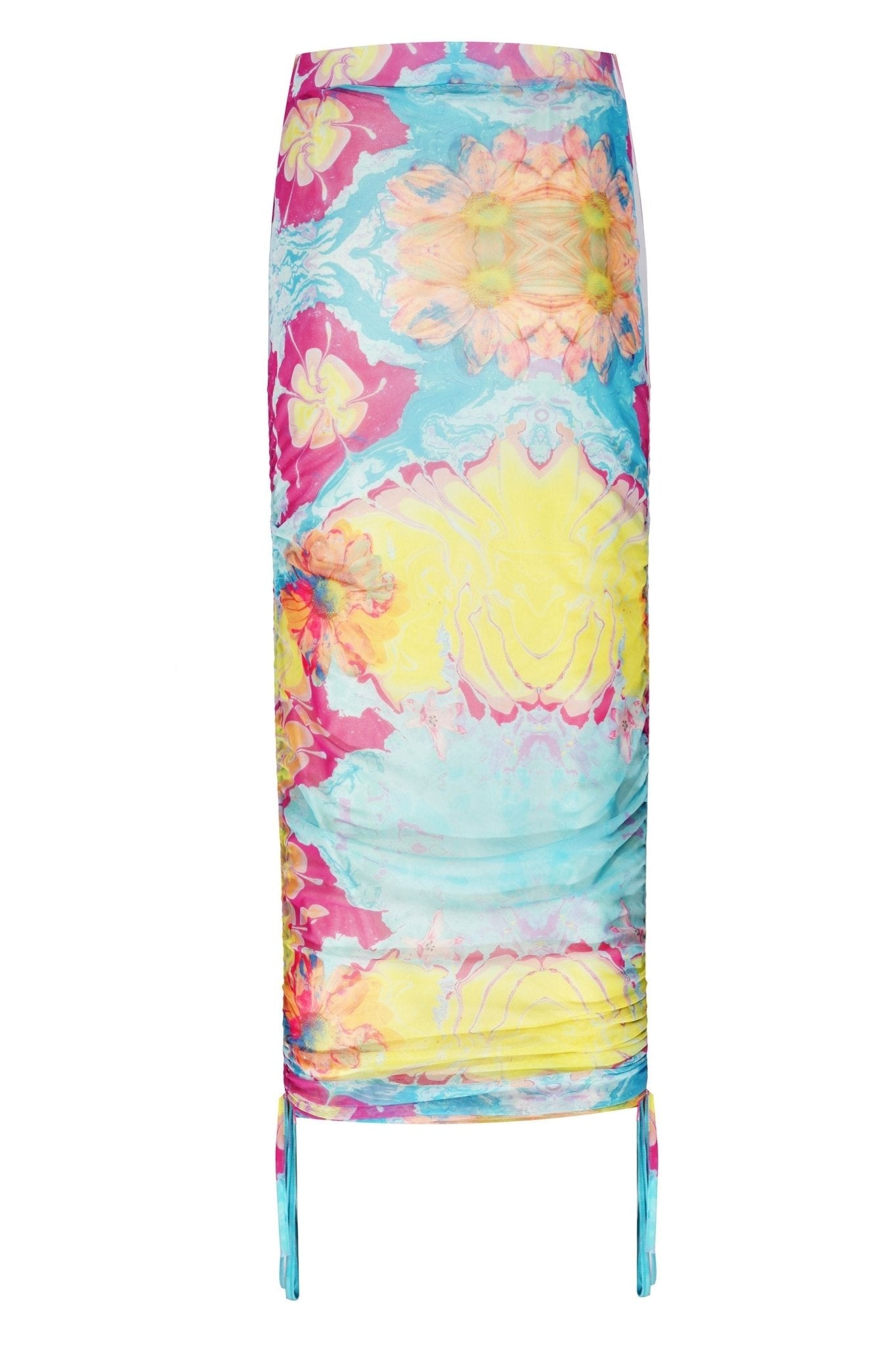 Side Ruched Printed Transparent Tulle Midi Skirt